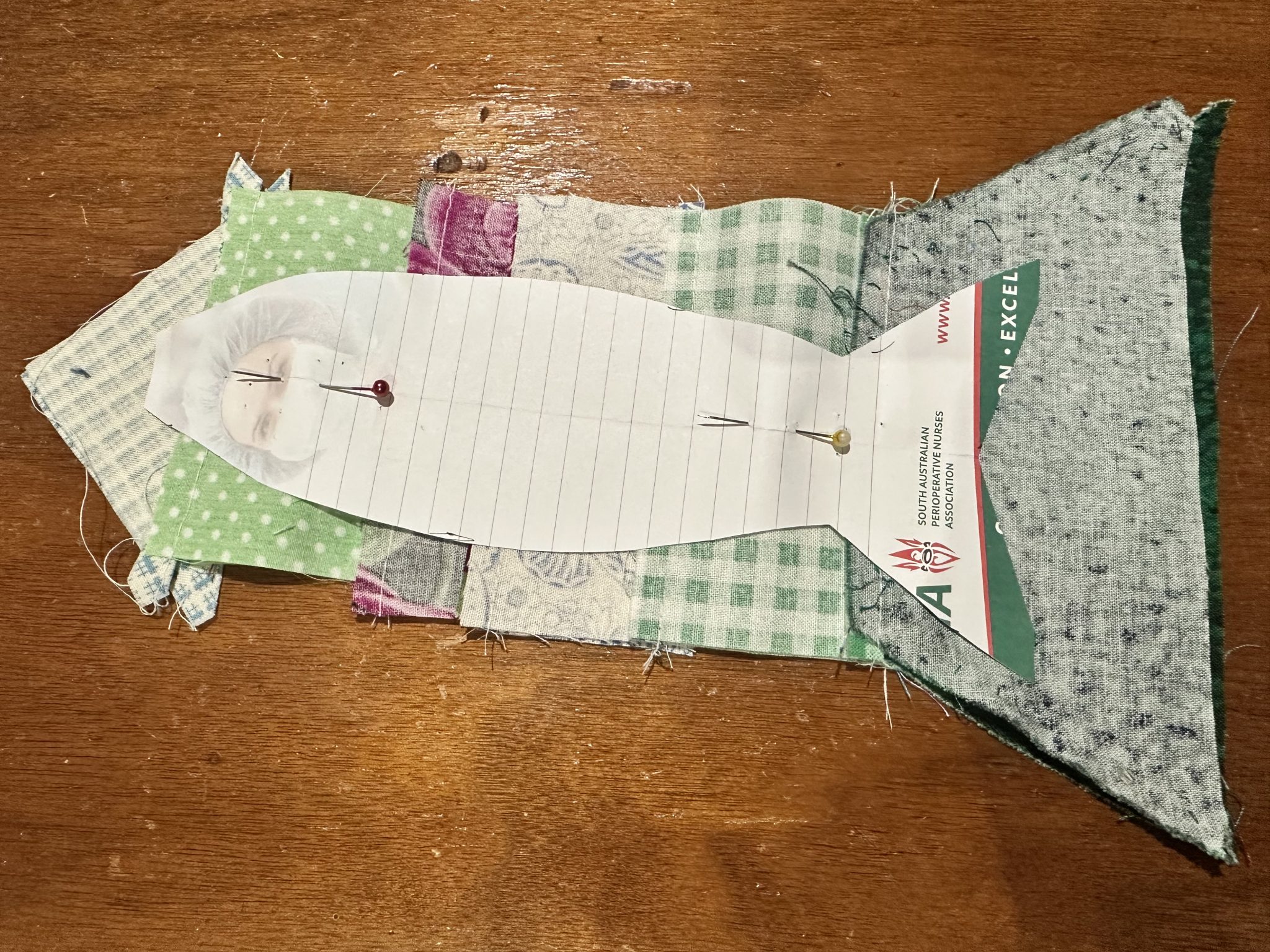 Align the two pieces of fabric right sides together. Make a loop from the string or ribbon whatever length you would like making different lengths is a good idea. Knot the two ends together. Lay this loop between the two pieces of fabric with the knot hanging out of the mouth end of the fish. Centre the pattern on the fabrics ensuring there is at least a quarter inch overhang of fabric all the way round pin the pattern to the fabrics.