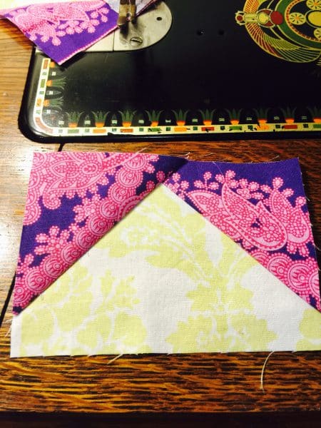 Take a 5″ x 3 1/2″ white yellow rectangle.  place a 3″ purple square with the marked diagonal on one corner.  Sew across the line.
