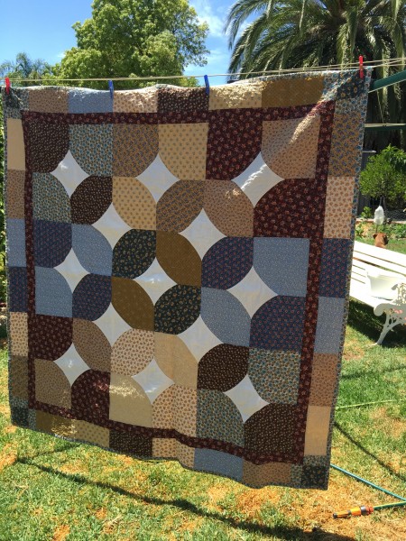 So I decided to make her 10 Minute Blocks from 10″ squares. I made 9 of them. I chose a palette of golds, browns and blues. I used unbleached calico for the block centres, to give the quilt definition. I adapted her block idea by then using the same technique to join the blocks together. Then added a border, followed by a second border of 5″ x 10″ rectangles, to compliment the quilt blocks,