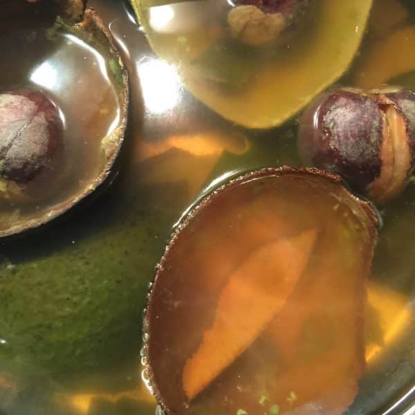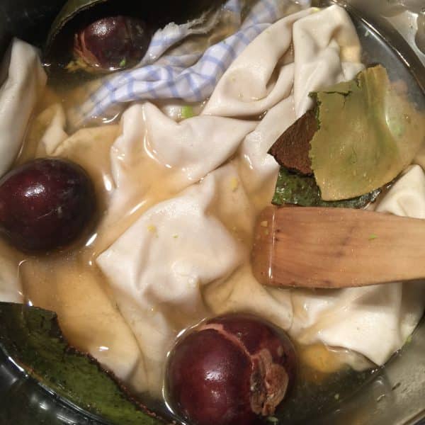 Clean the avocado skins and seeds of avocado flesh. Put into the saucepan with the fabric and just barely enough water to cover.
